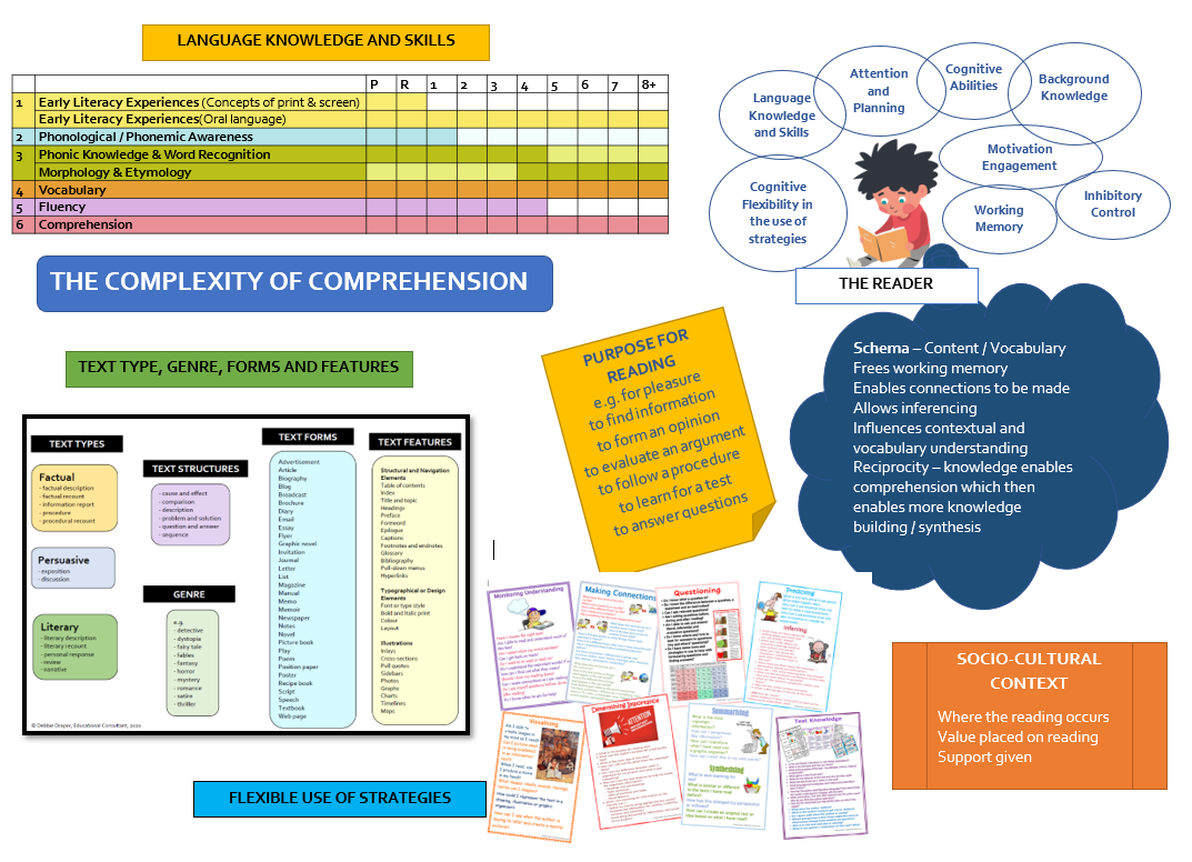 Reading comprehension, oral and language comprehension are highly correlated. To be skilled comprehenders, readers need to be automatic and strategic with all elements of the reading rope and be able to select and use cognitive and metacognitive strategies. This means that students need to be explicitly taught how to monitor their comprehension, understand when meaning breaks down and be able to select and use appropriate fix-up strategies to build meaning.